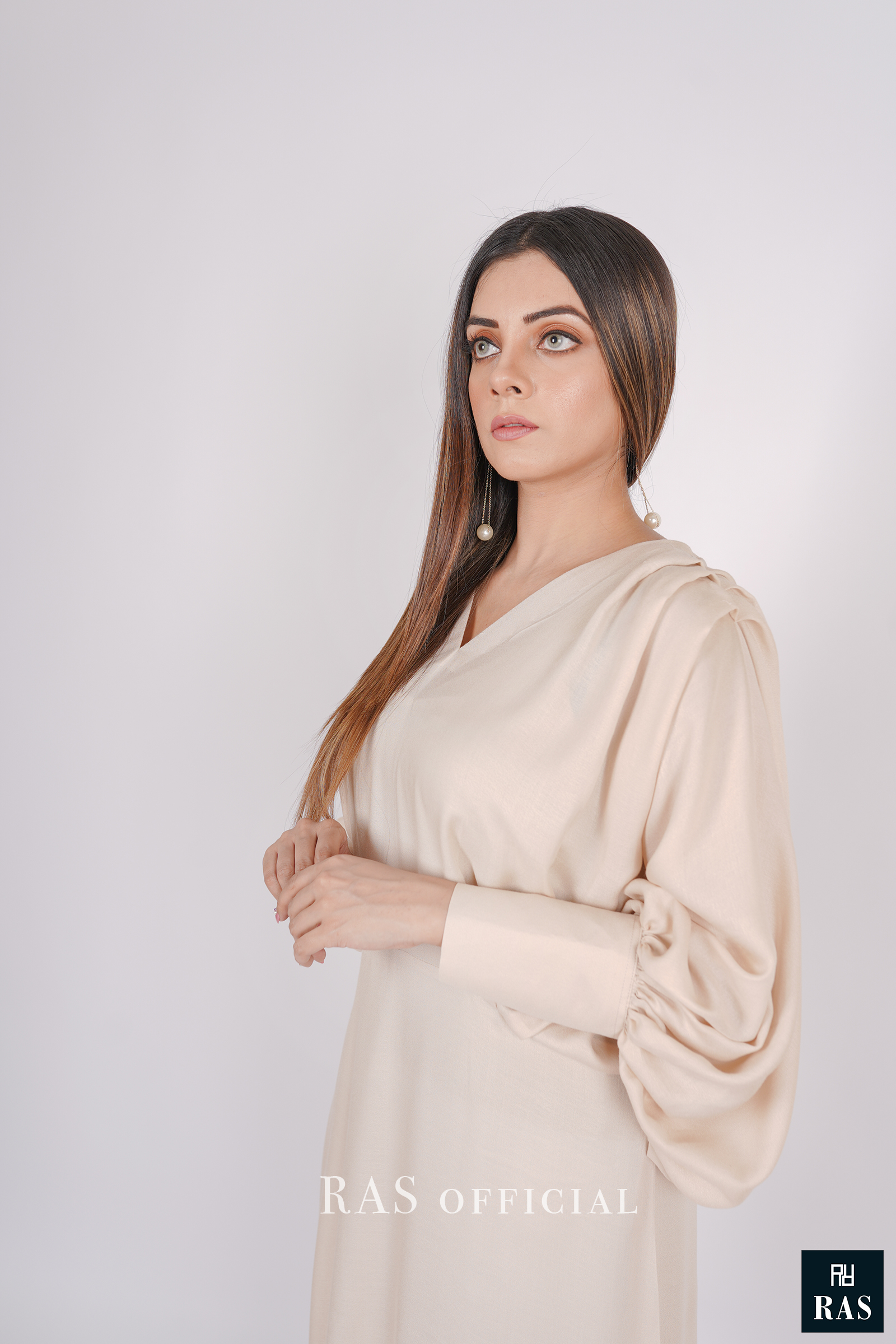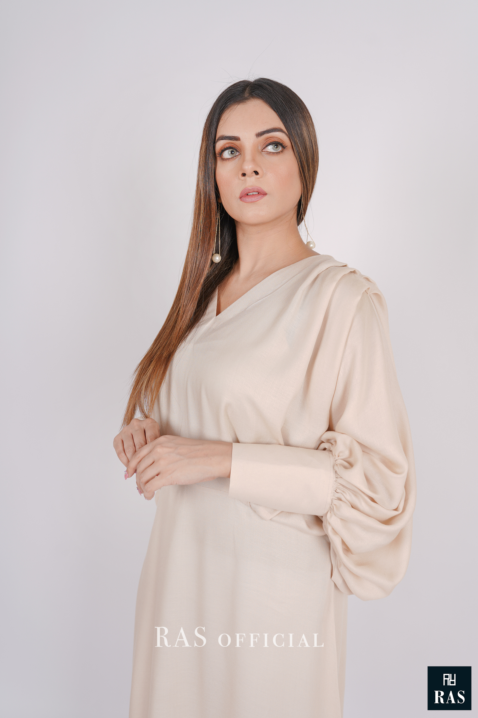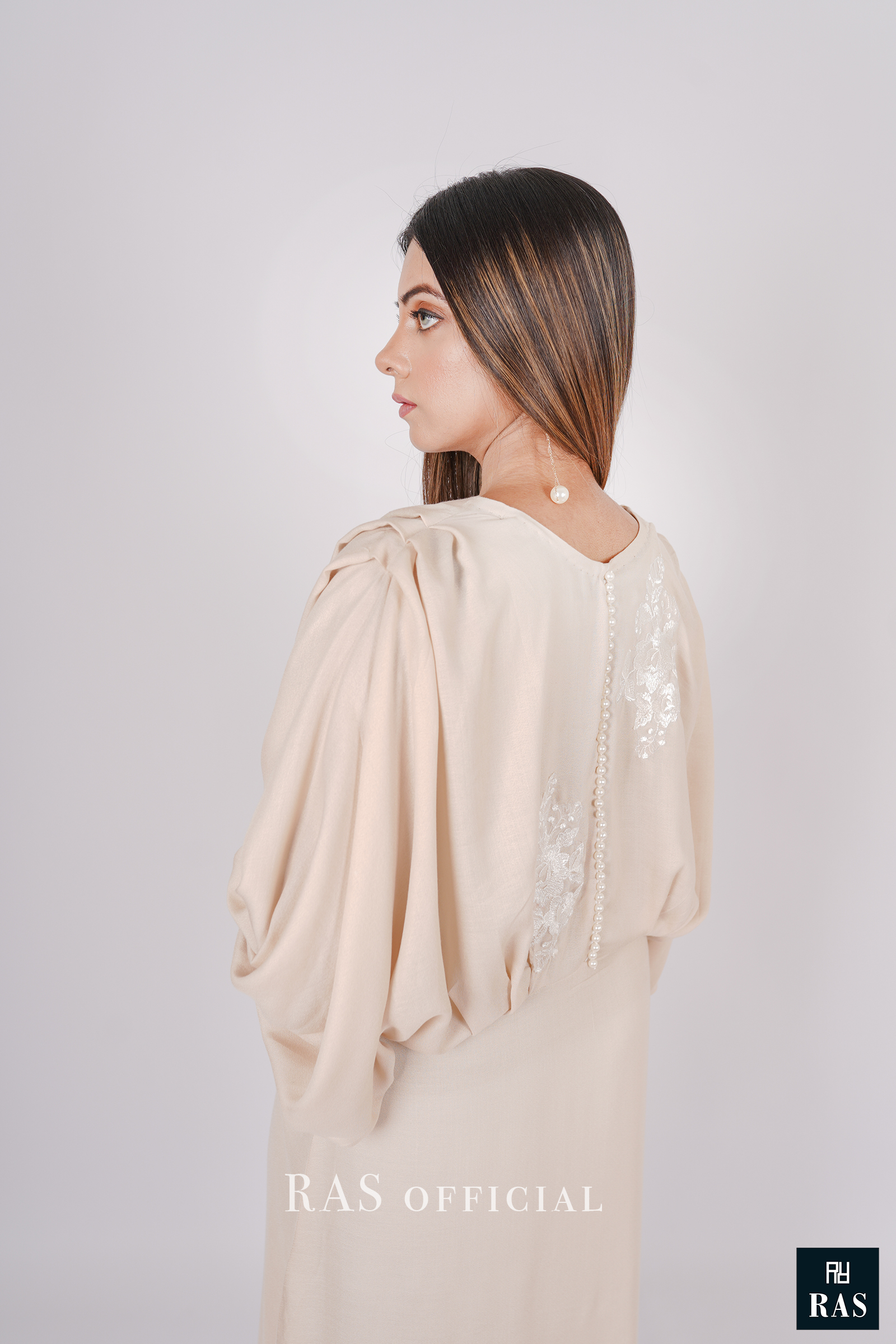 Classic beige, pure imported soft grip fabric with hint of pearls and intricate embroidery on back. Victorian style sleeves with pearls detailing.