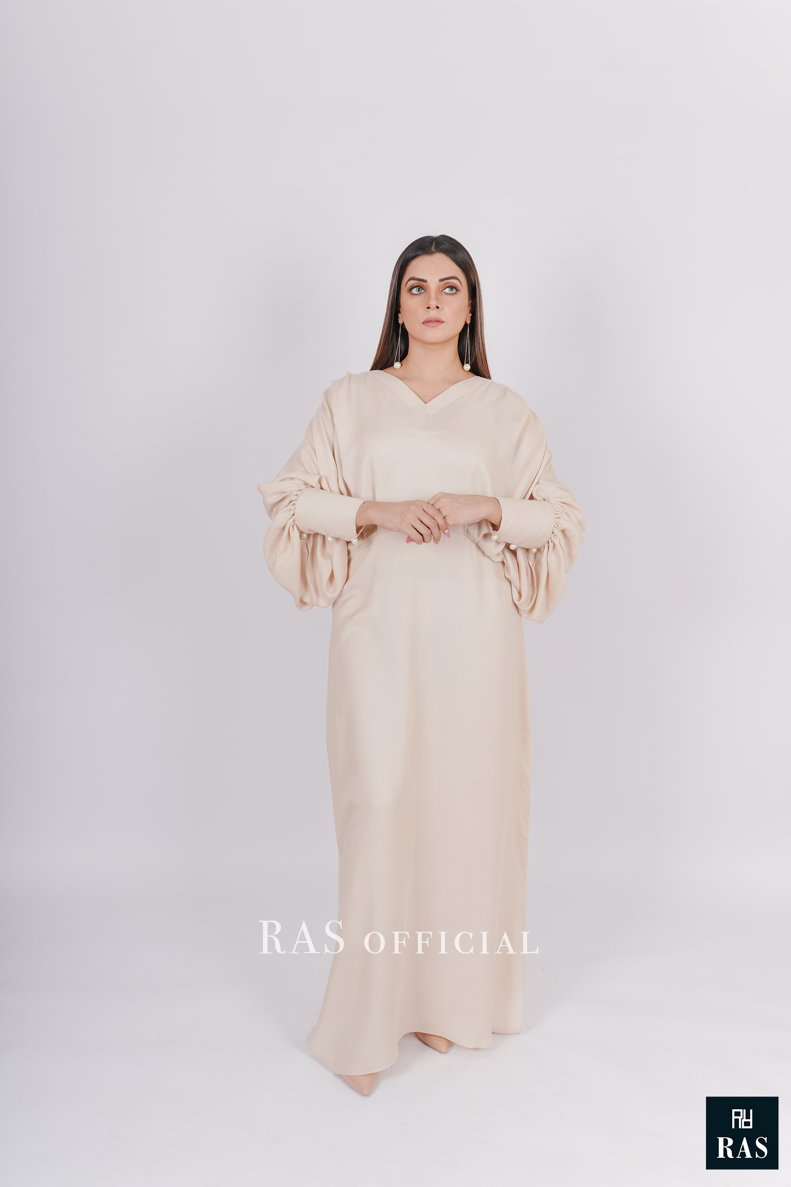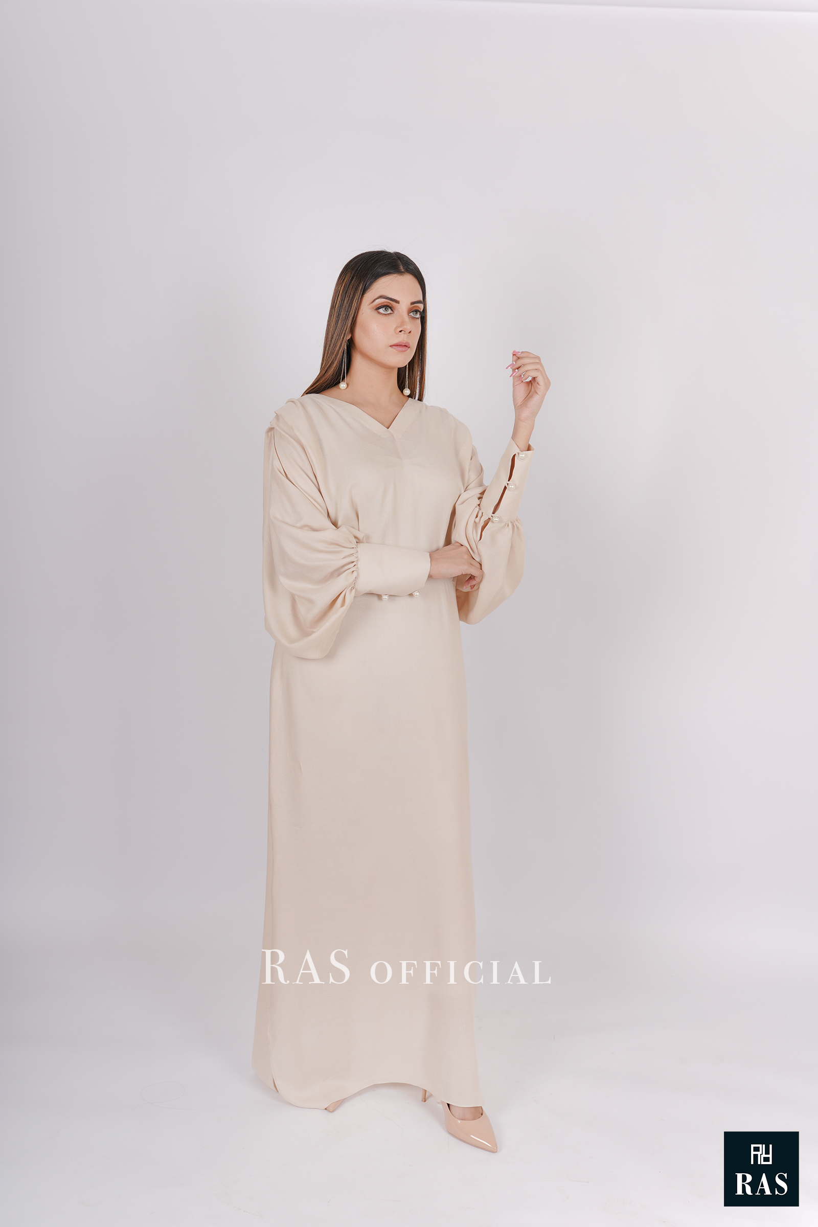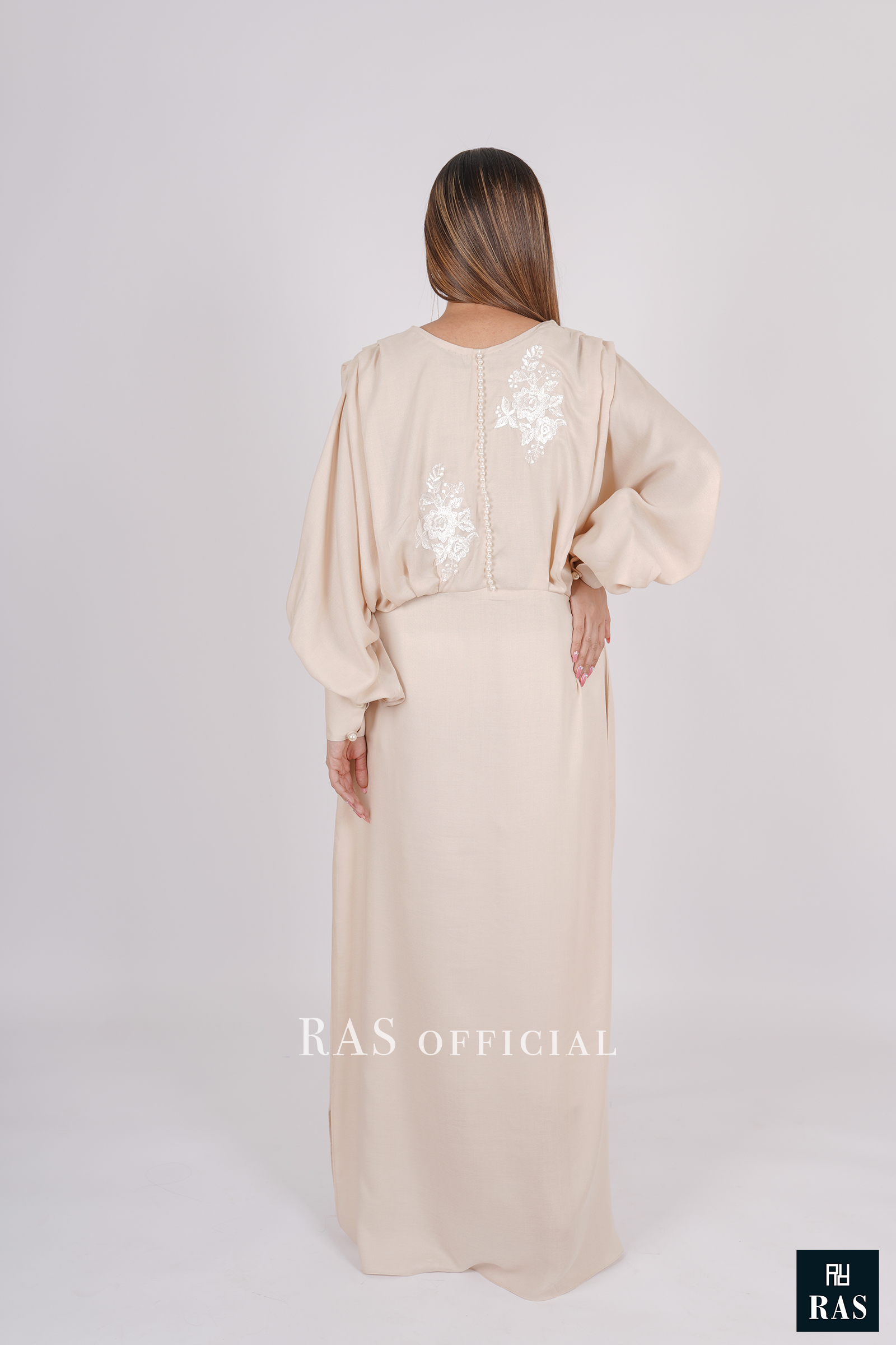 Classic beige, pure imported soft grip fabric with hint of pearls and intricate embroidery on back. Victorian style sleeves with pearls detailing.