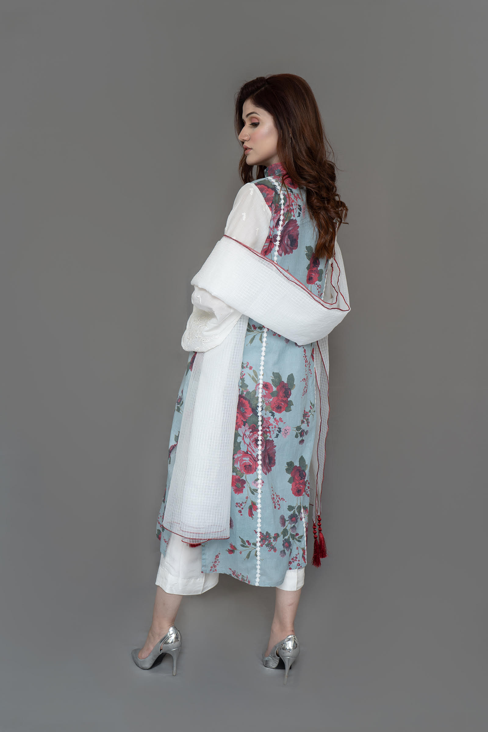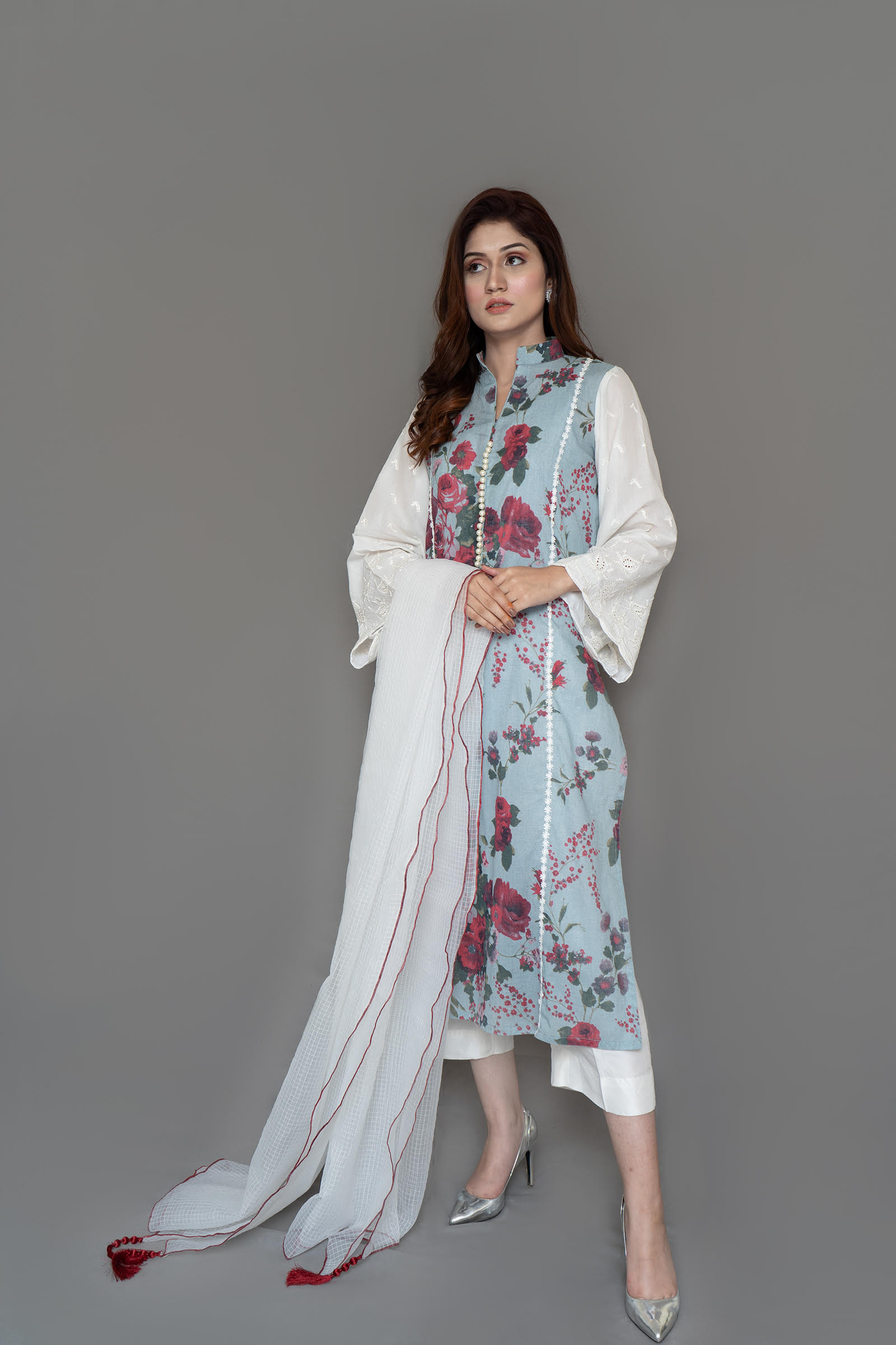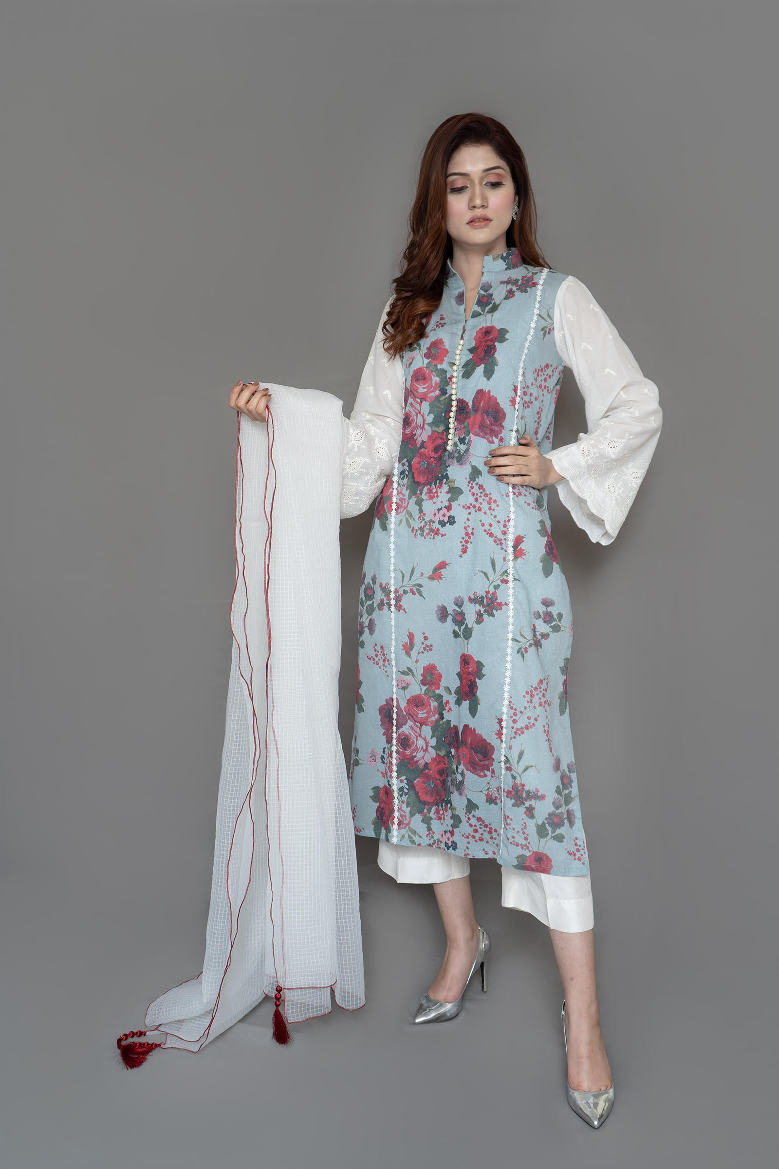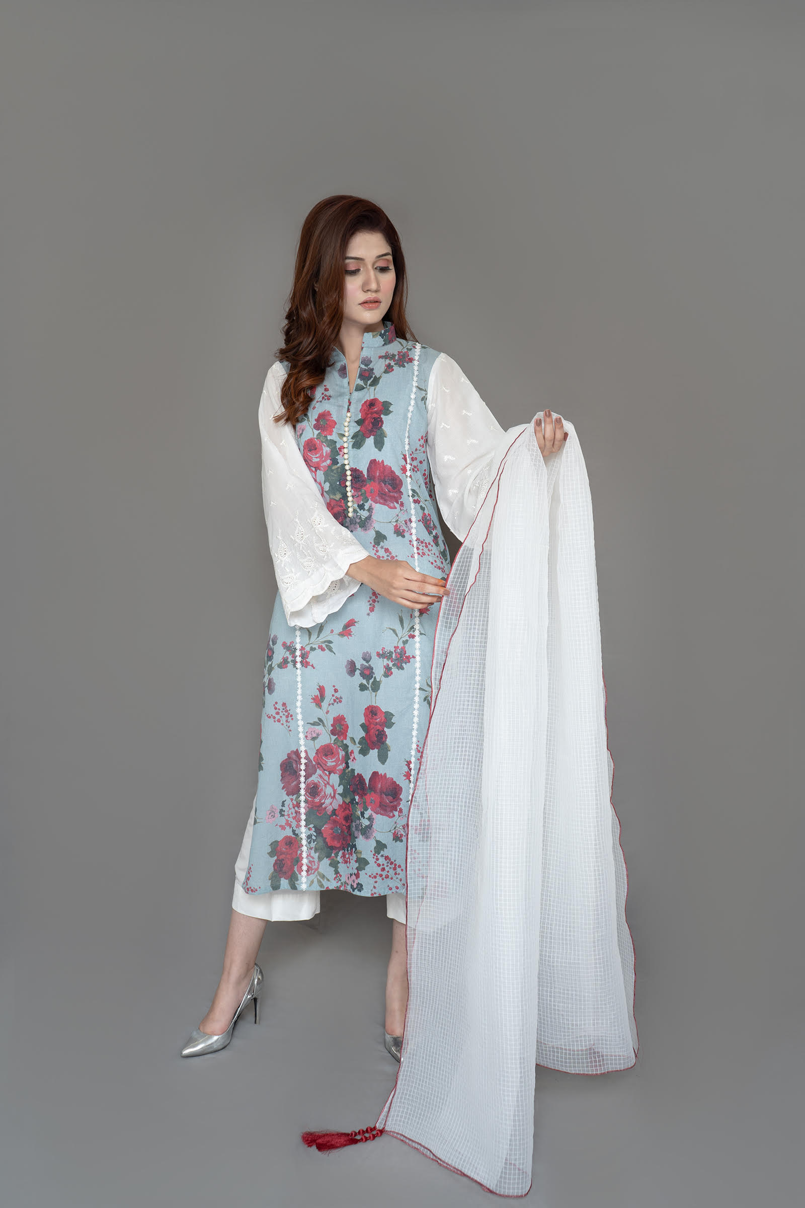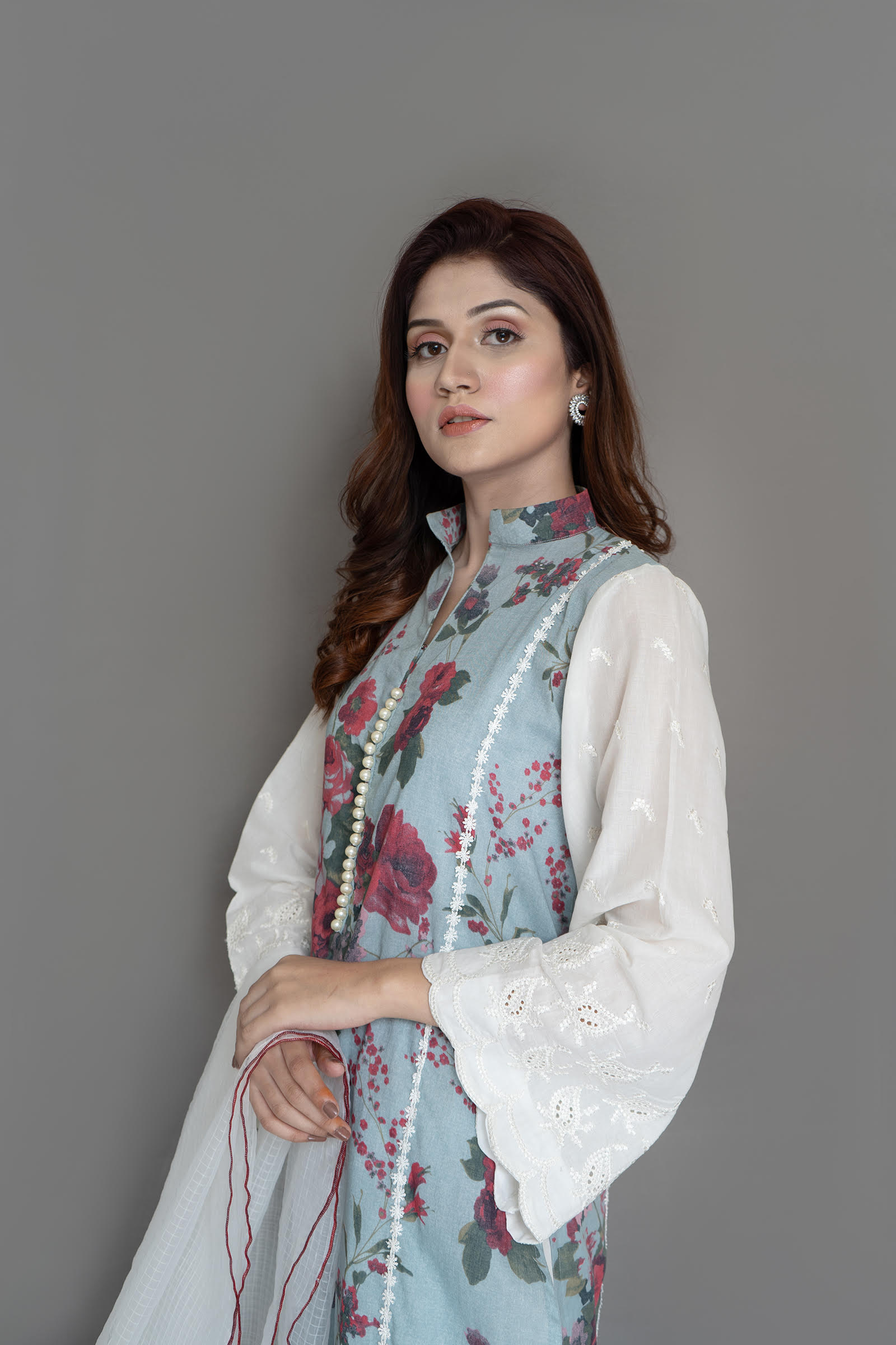Pure lawn shirt with embroidered sleeve, pearls detailing on neck slit. Paired with self textured organza duppata 2 piece