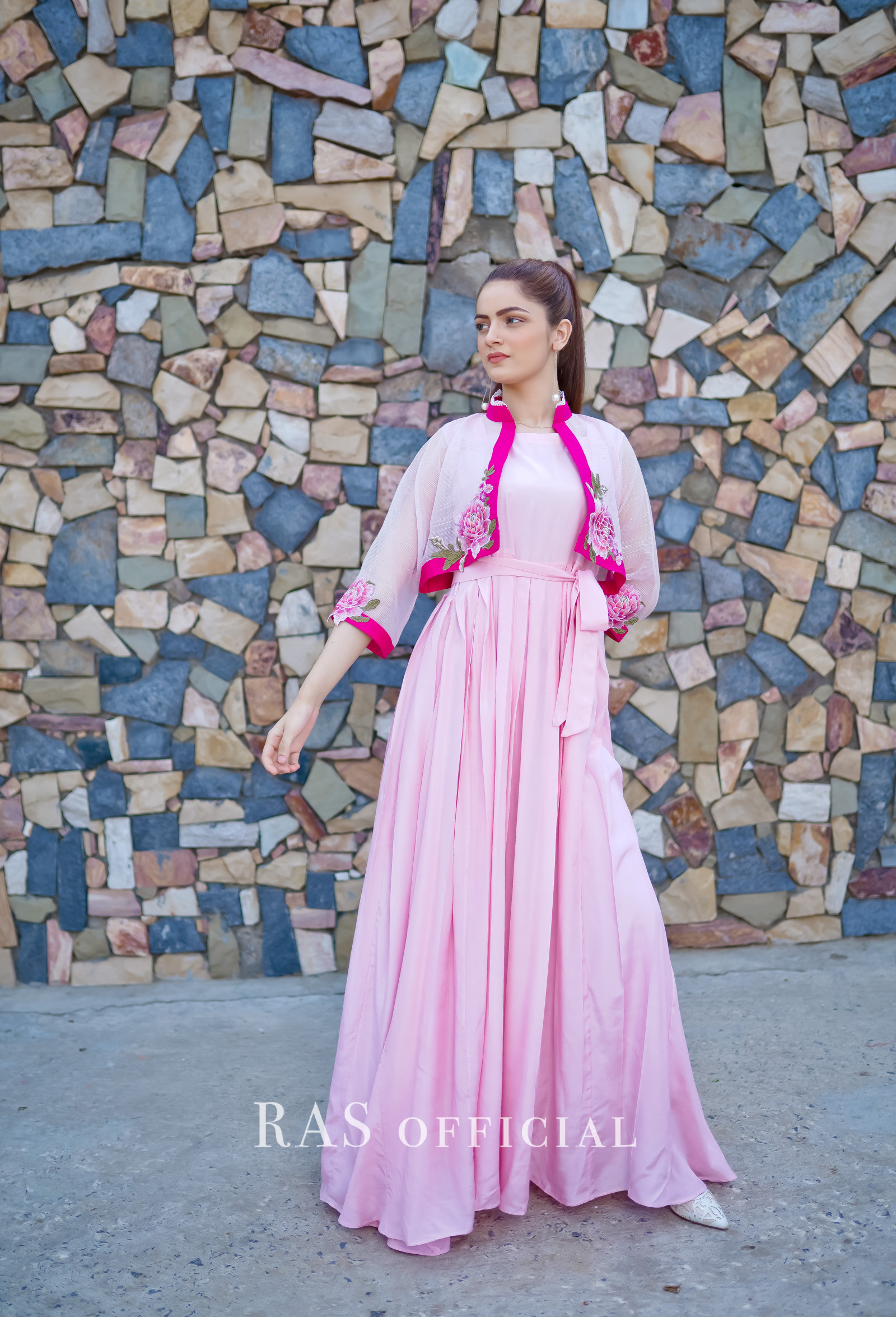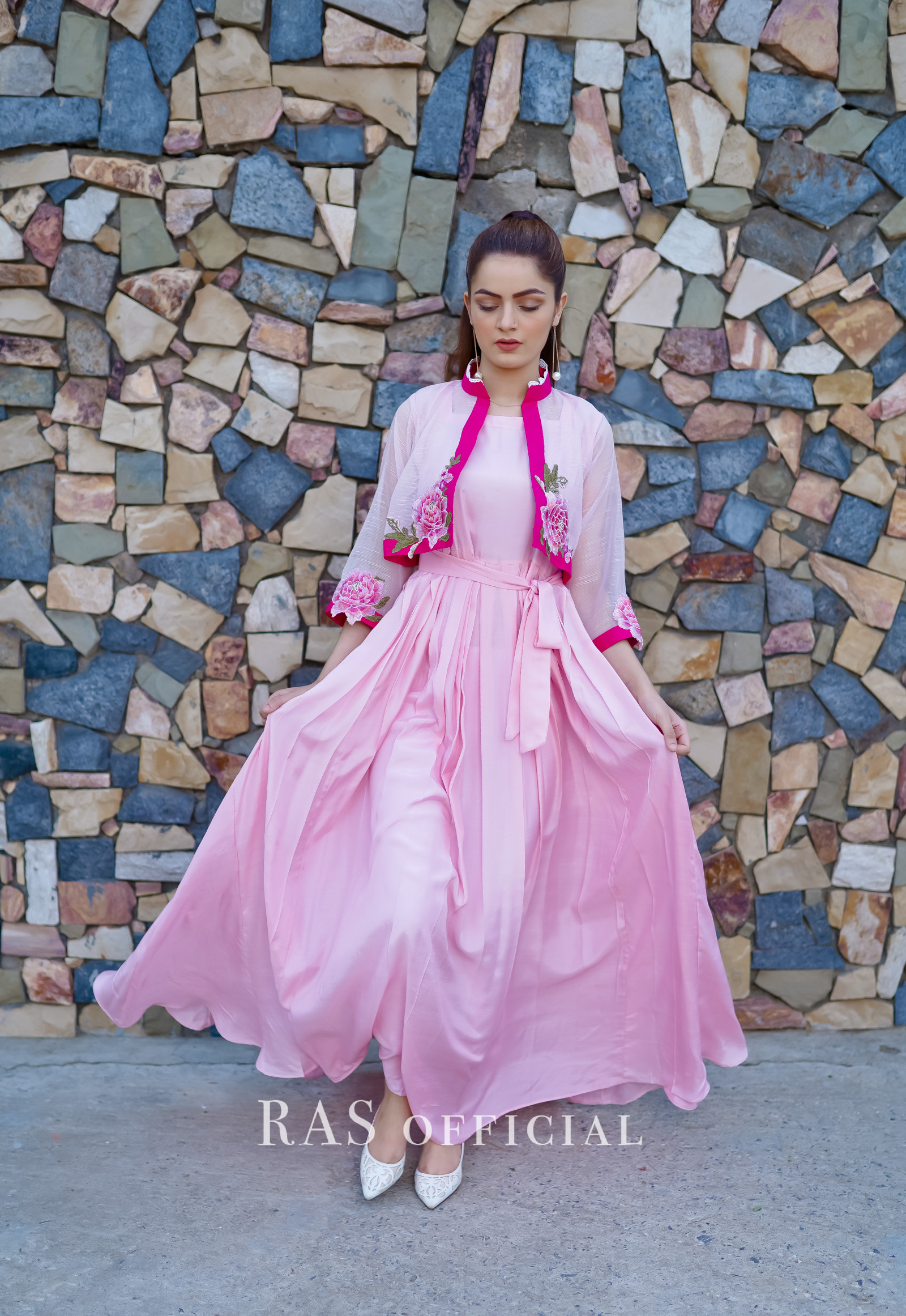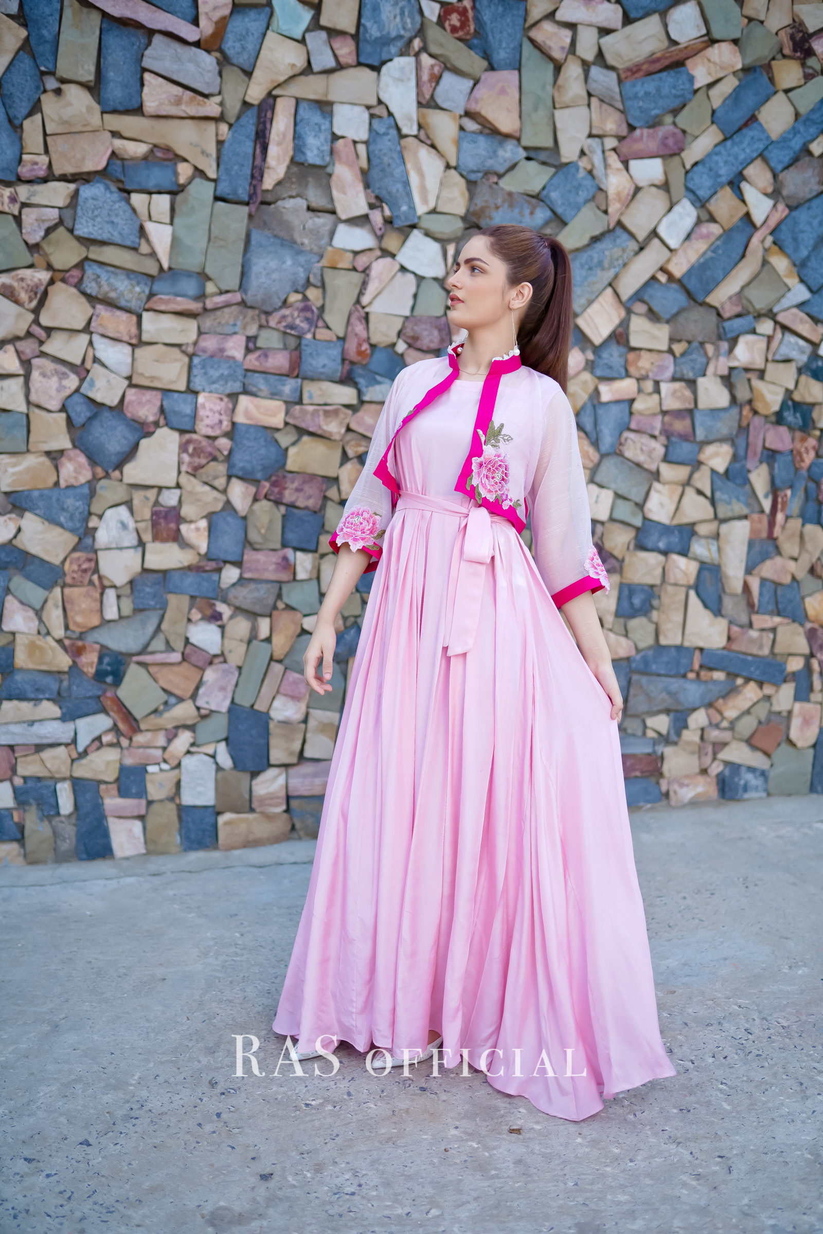 Delicately embroidered bolero jacket with silk pleated frock 2 piece set.