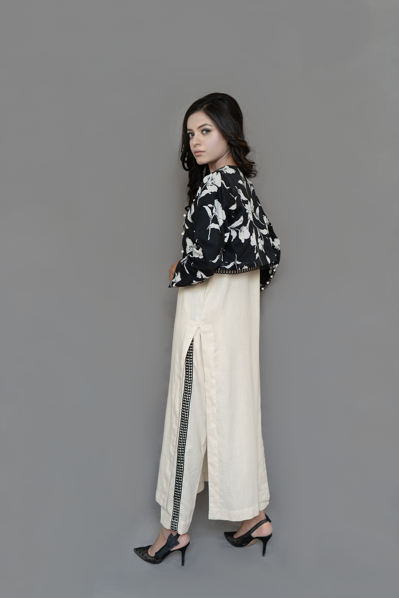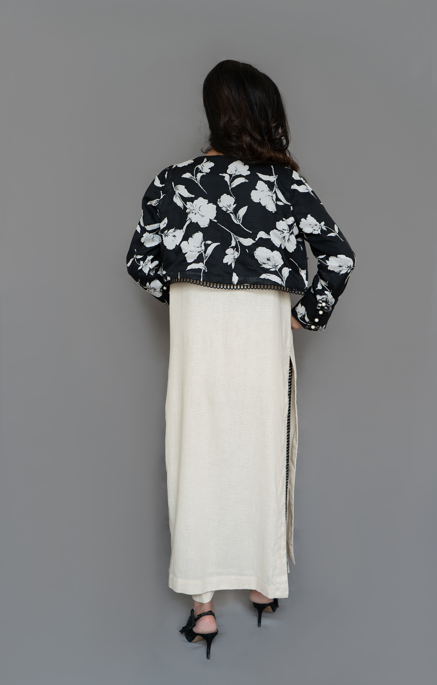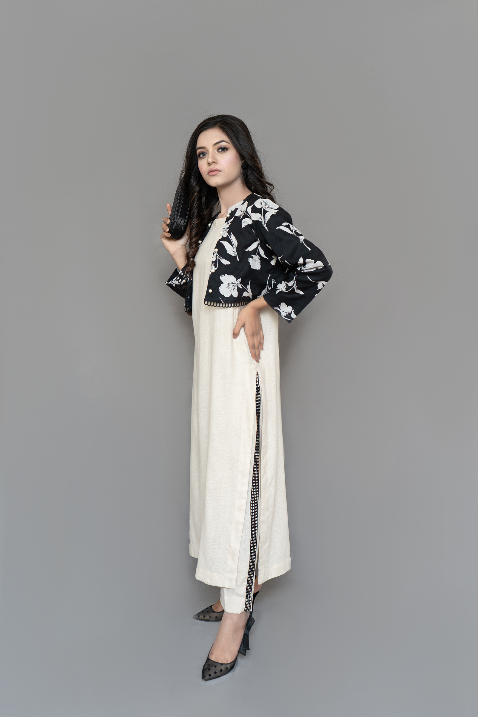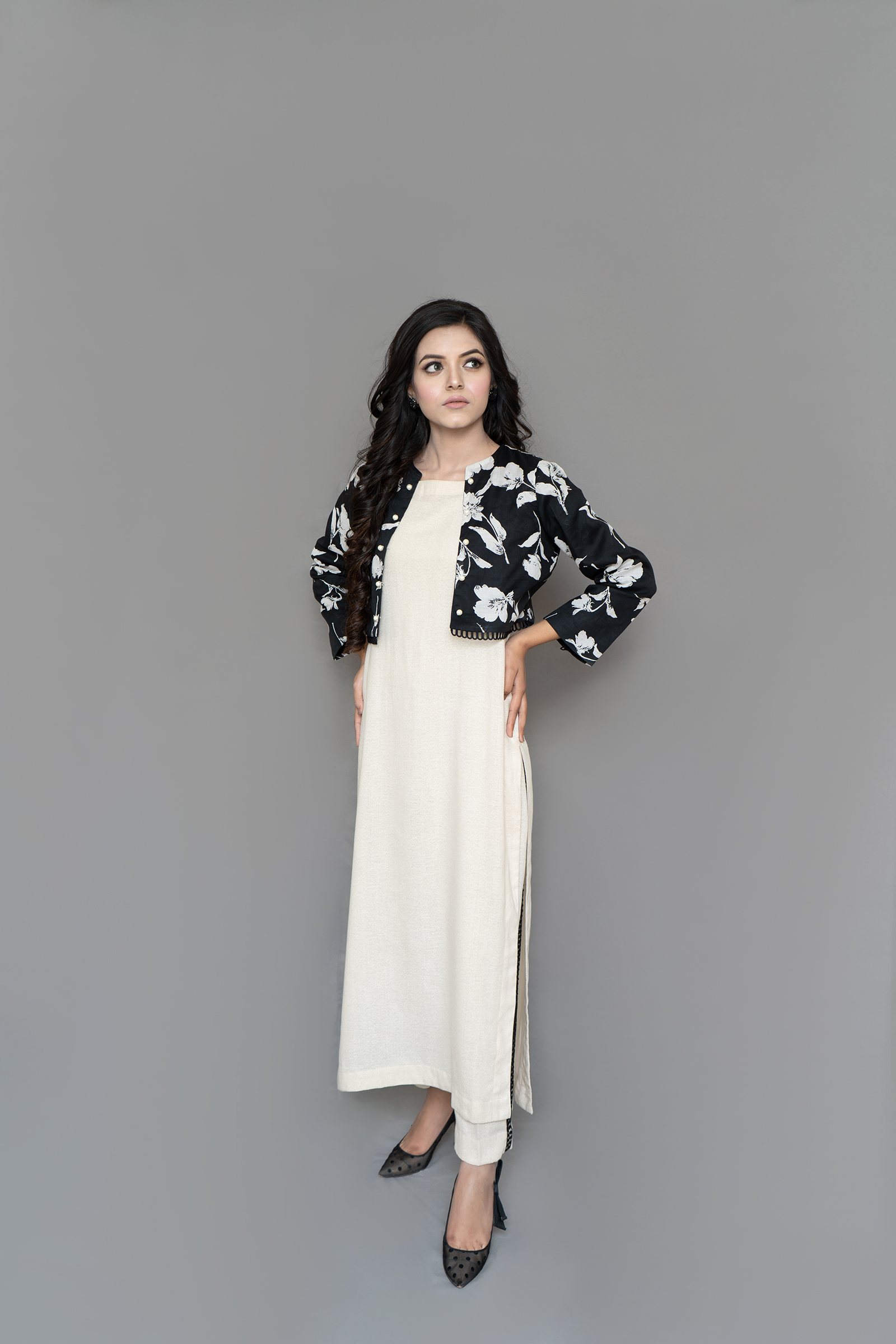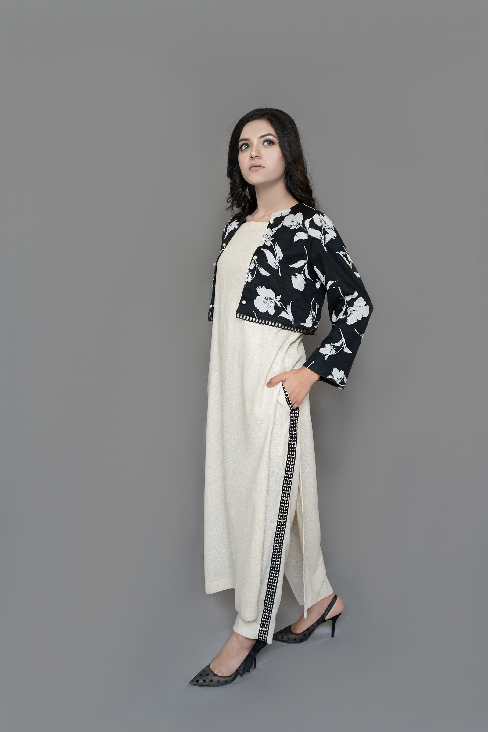 pure Swiss lawn bolero jacket, karandi lawn long shirt, and pants with pockets, 3 piece set.