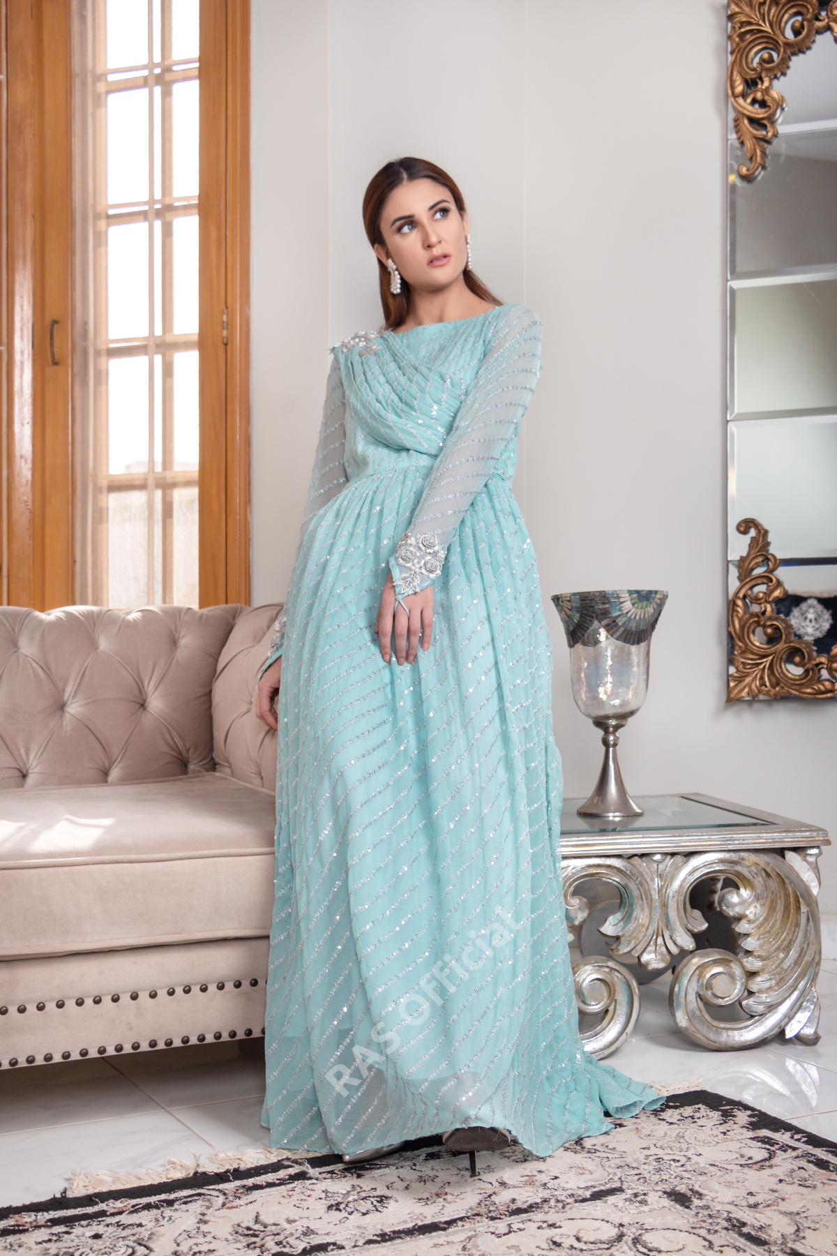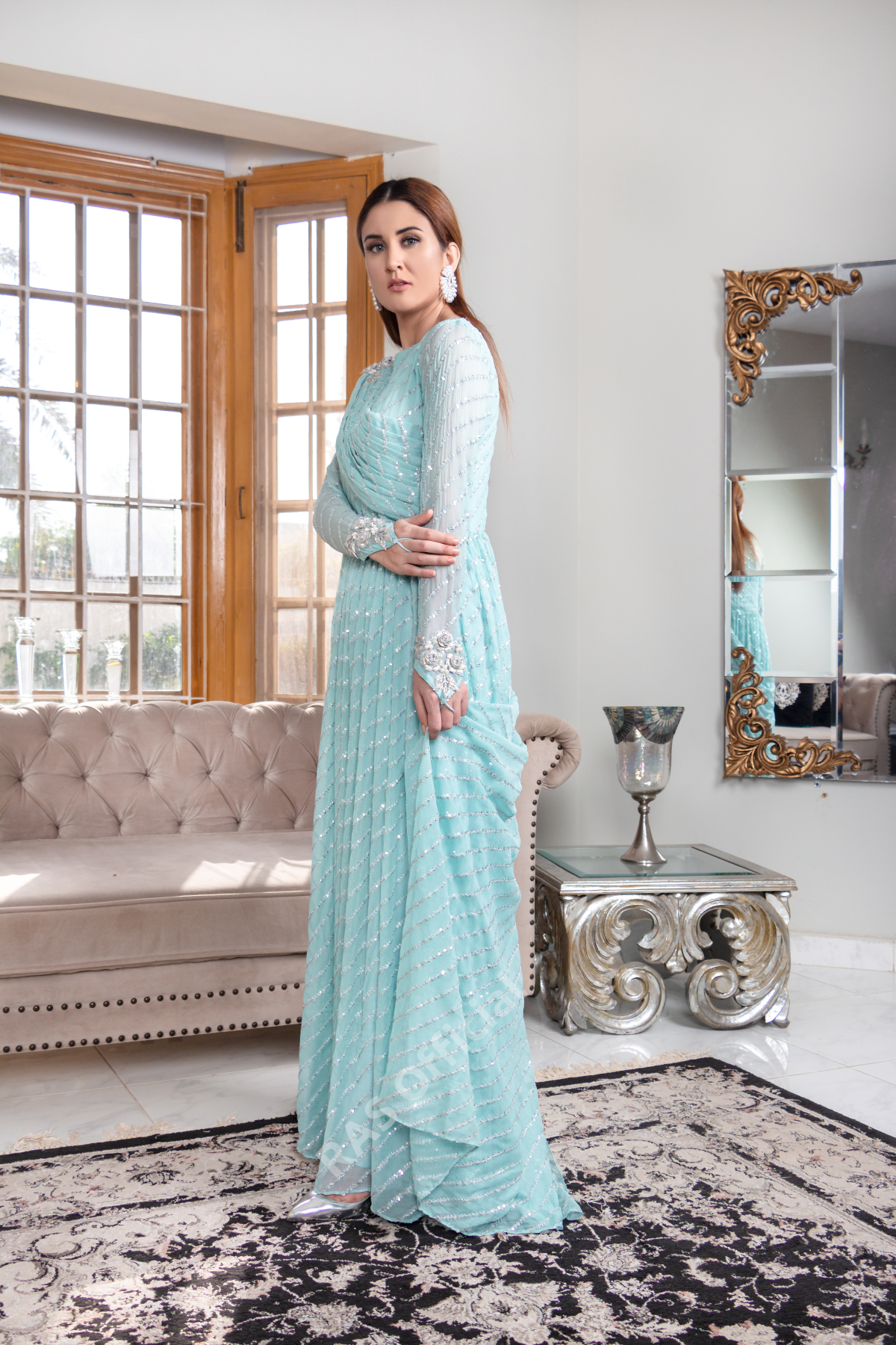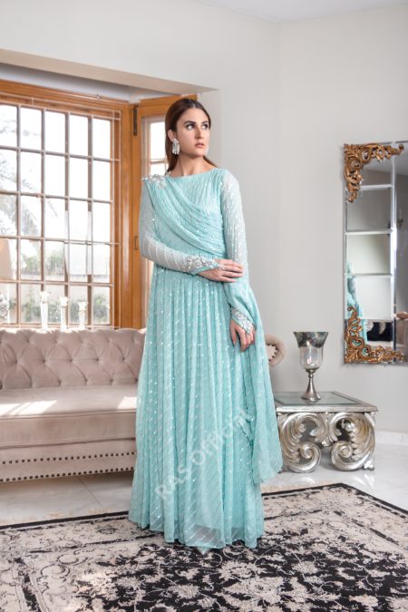 Delicately embroidered pure chiffon pleated frock with exaggerated pallo, qora naqshi and pearls embellished appliqu? motives on princess sleeves and shoulder to hold the pallo. Frock length 57