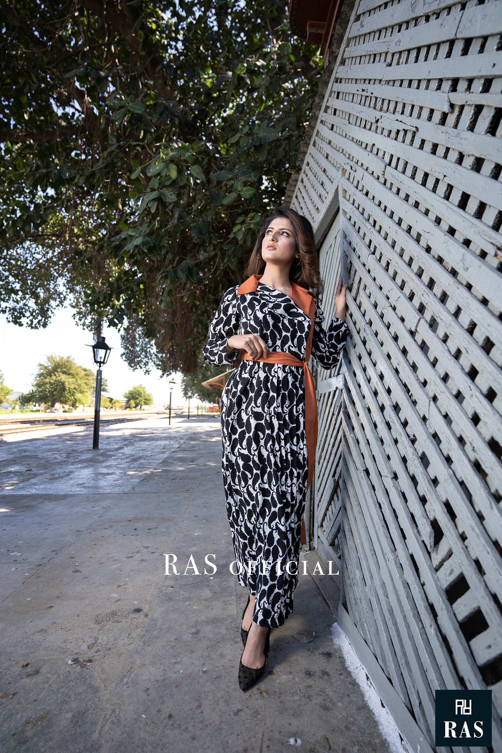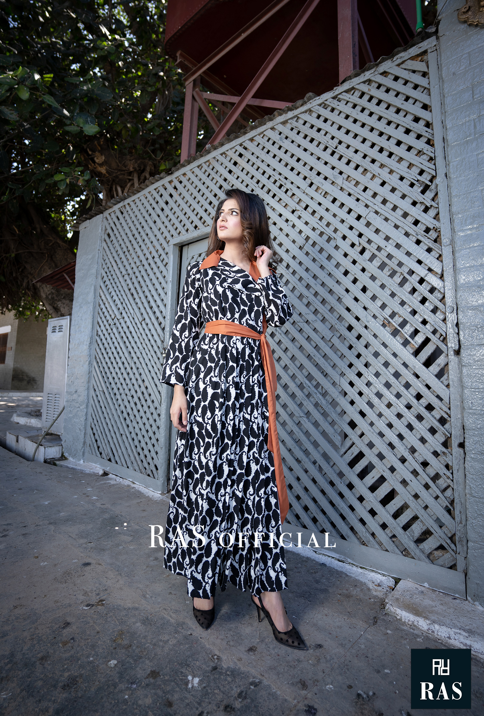 Asymmetric paisley printed pleated frock with lapel. Belt included.