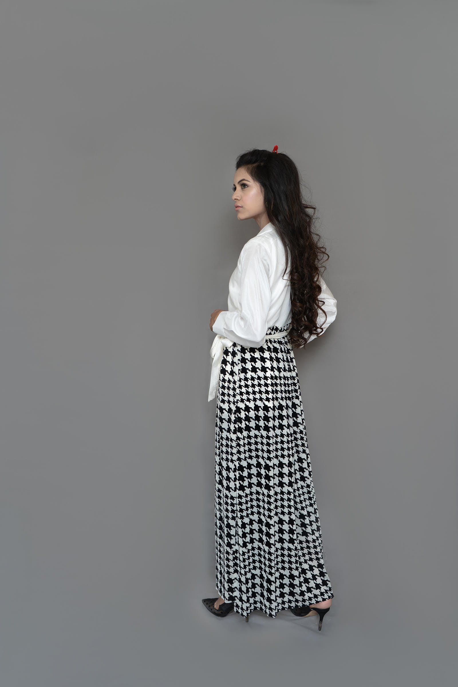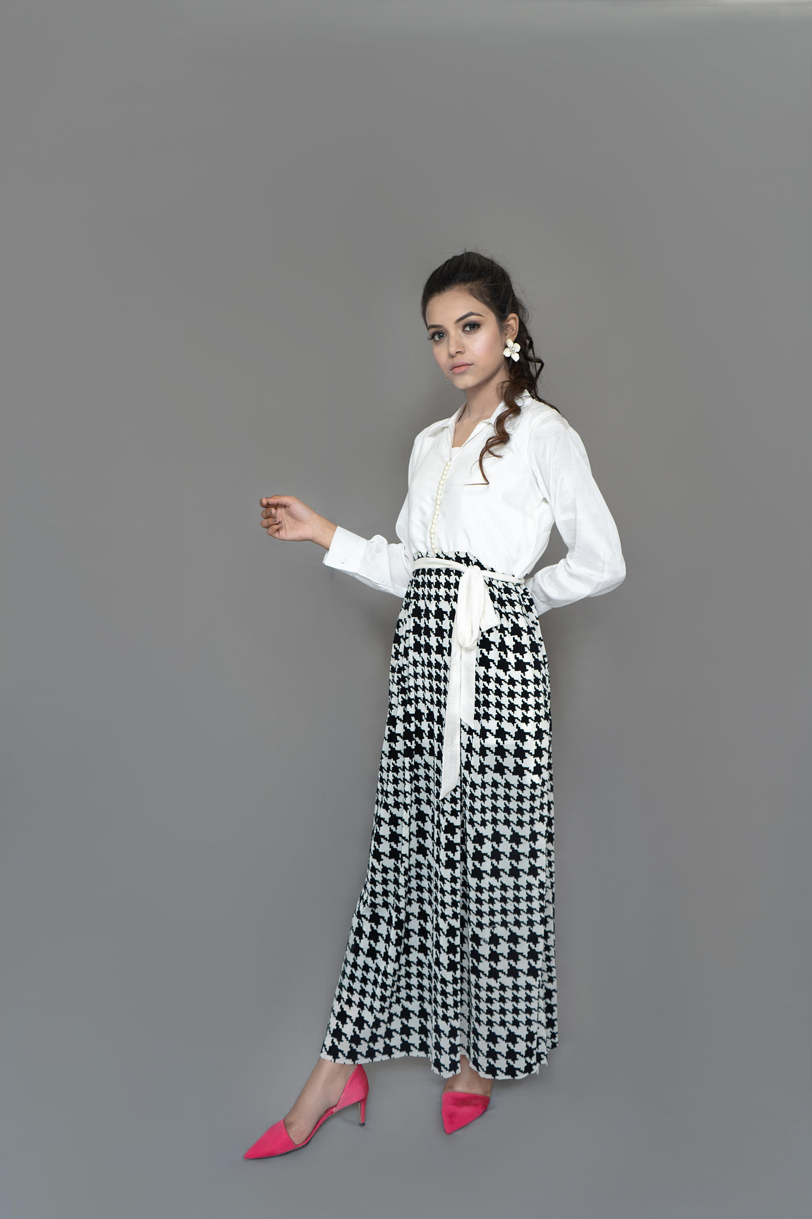 Pure cotton silk and Scottish net long dress finished with pearls on neck slit.
