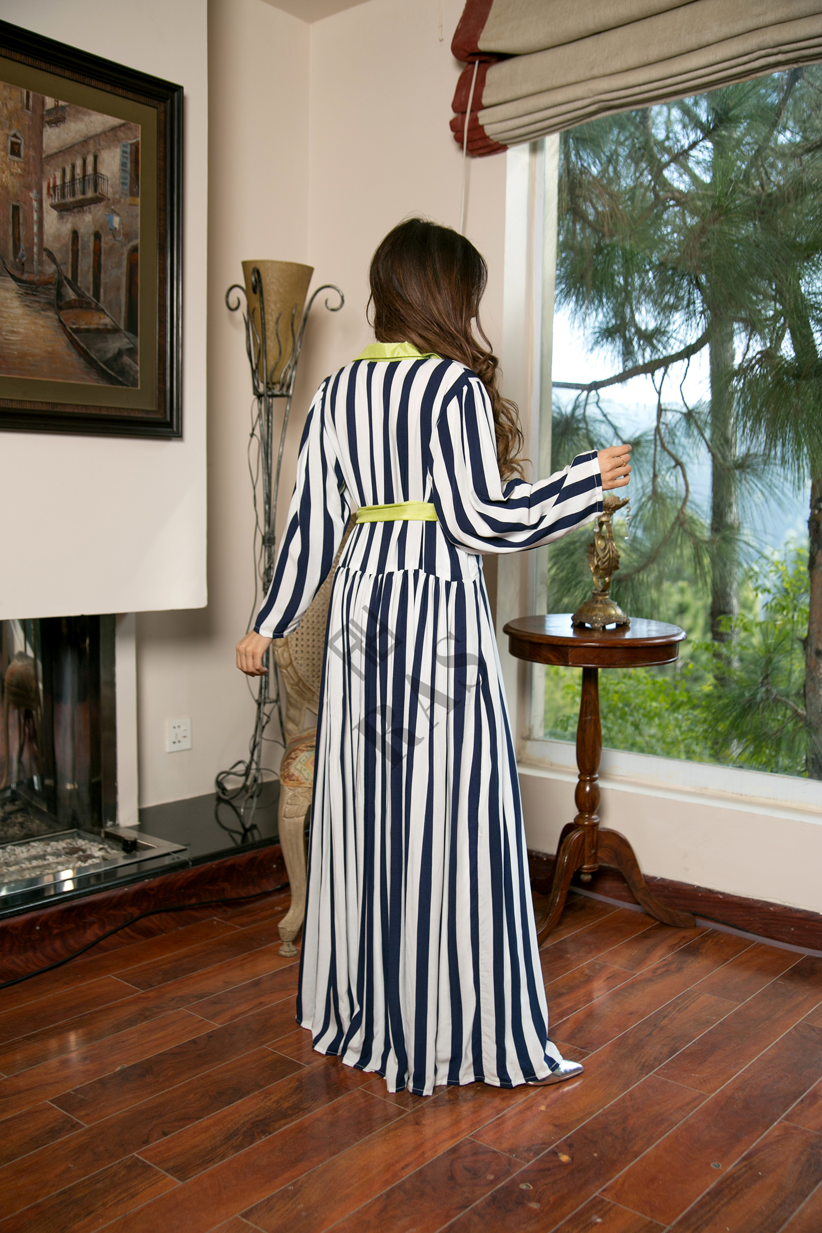 Chamose silk frock adorned with pearls on shoulder and cuffs