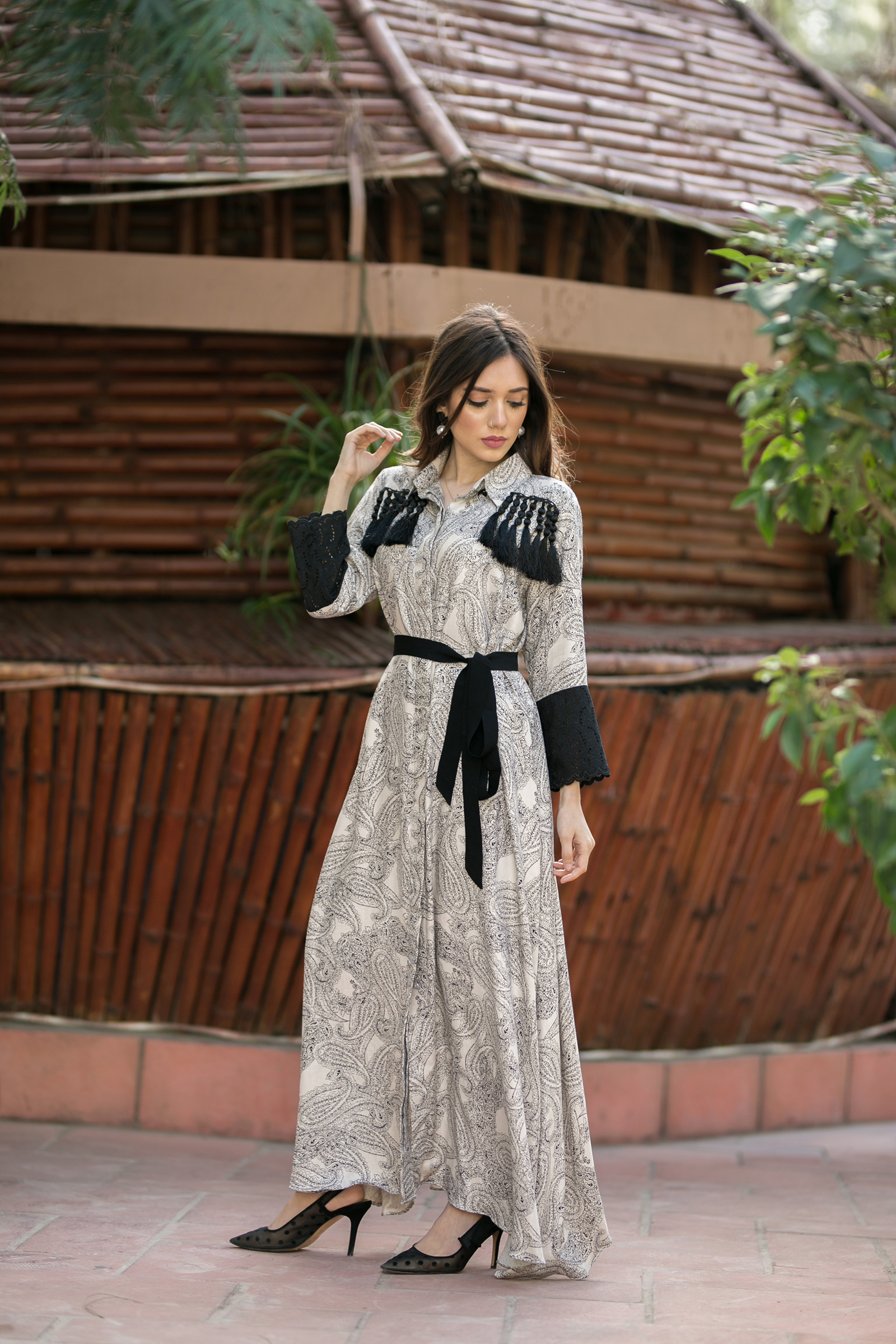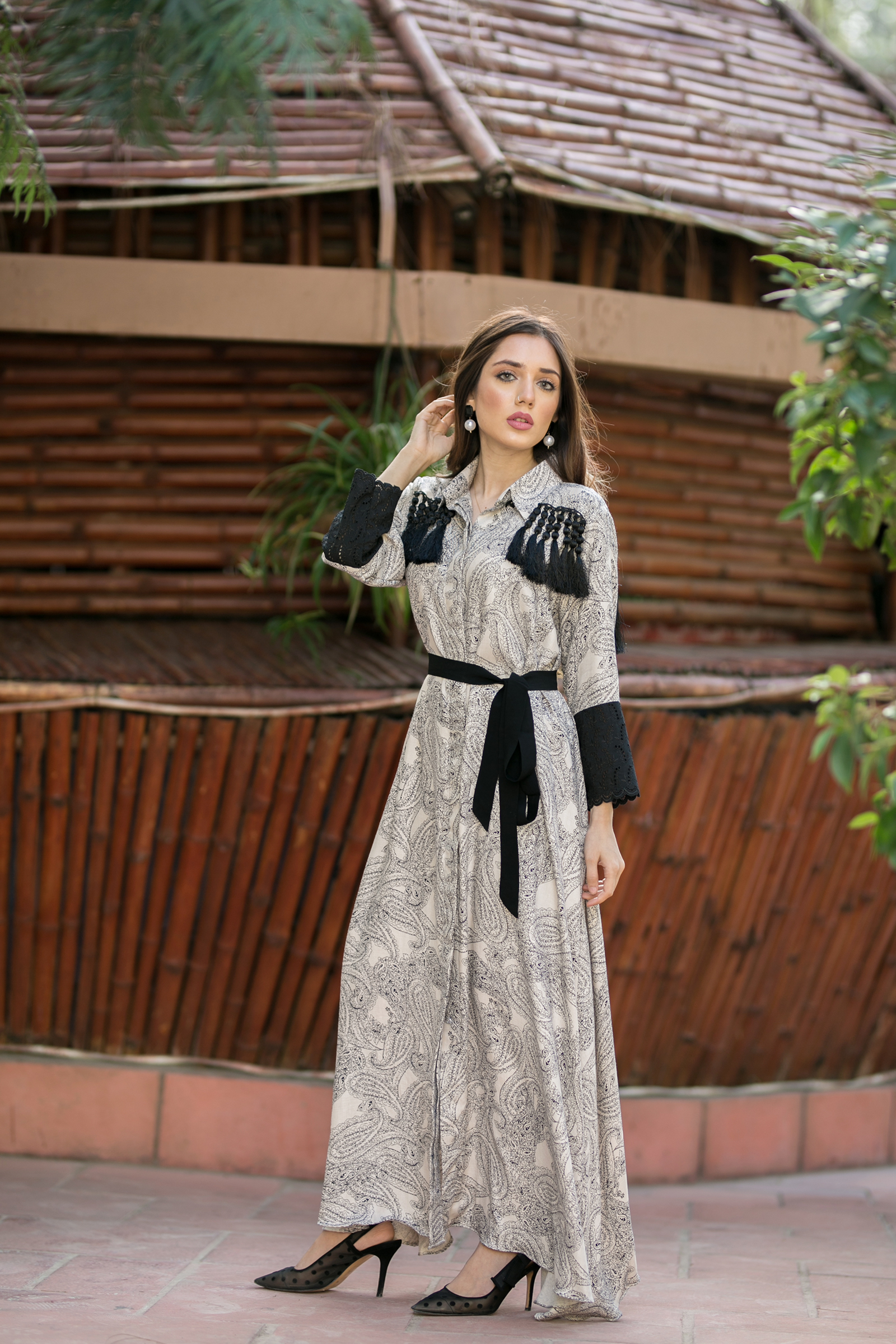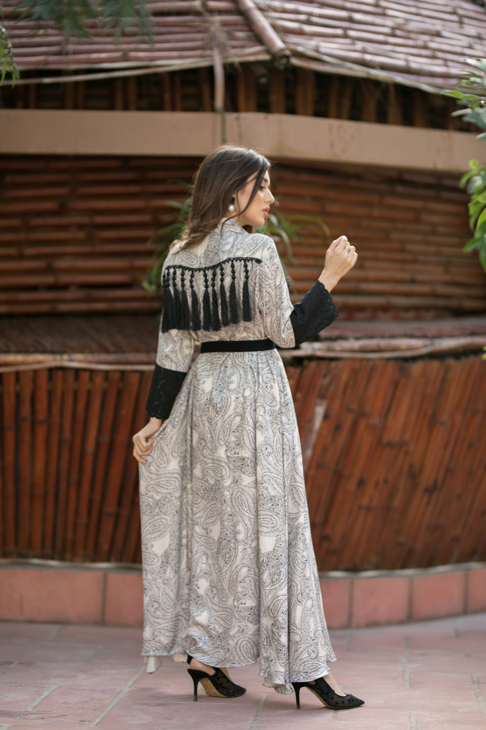 Shahtoosh fabric open long frock Chikan embroidered sleeves patch with tussle detailing on front and back 50 length