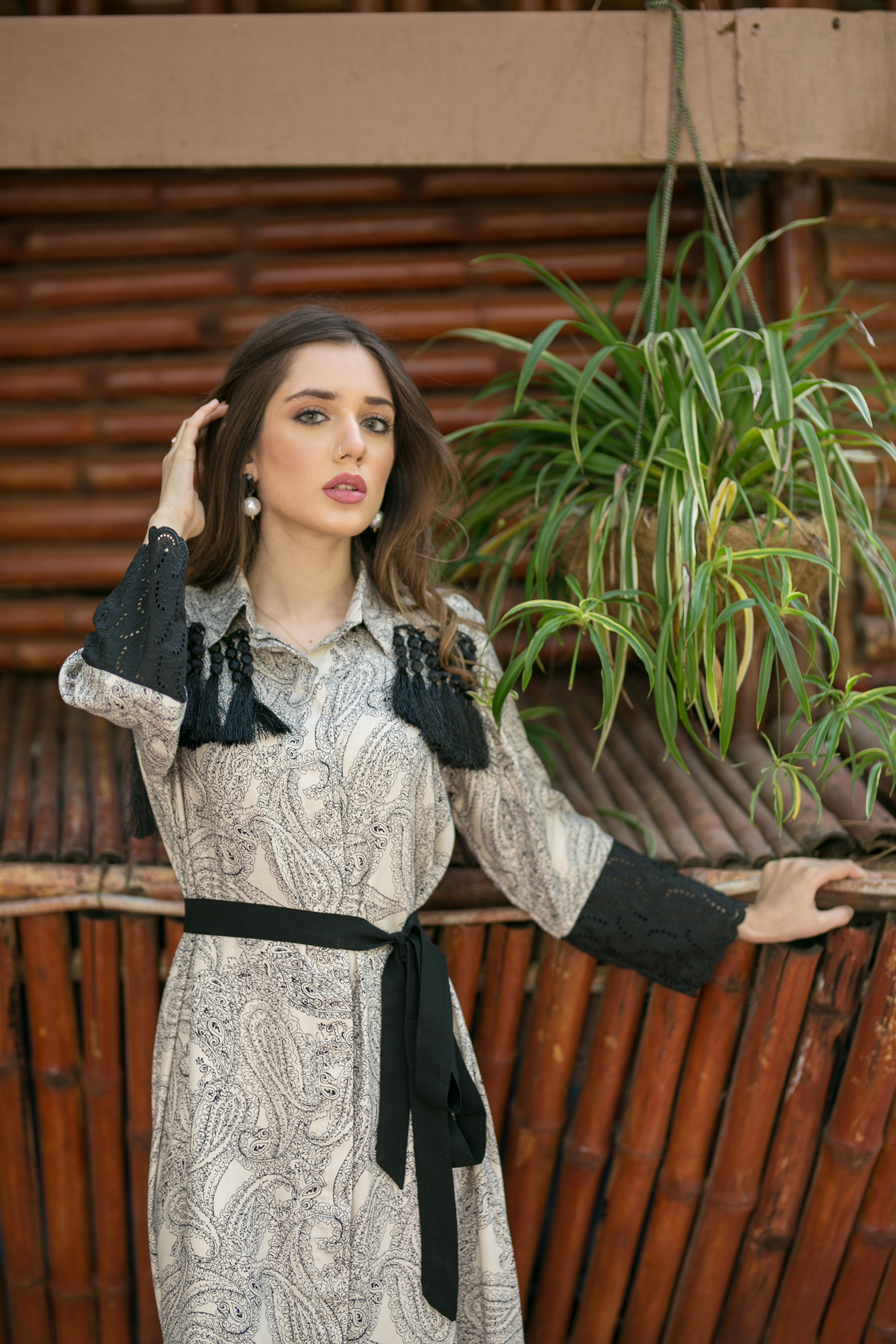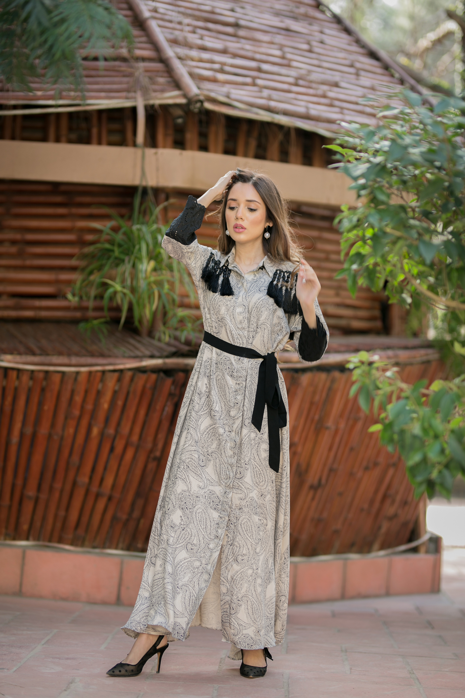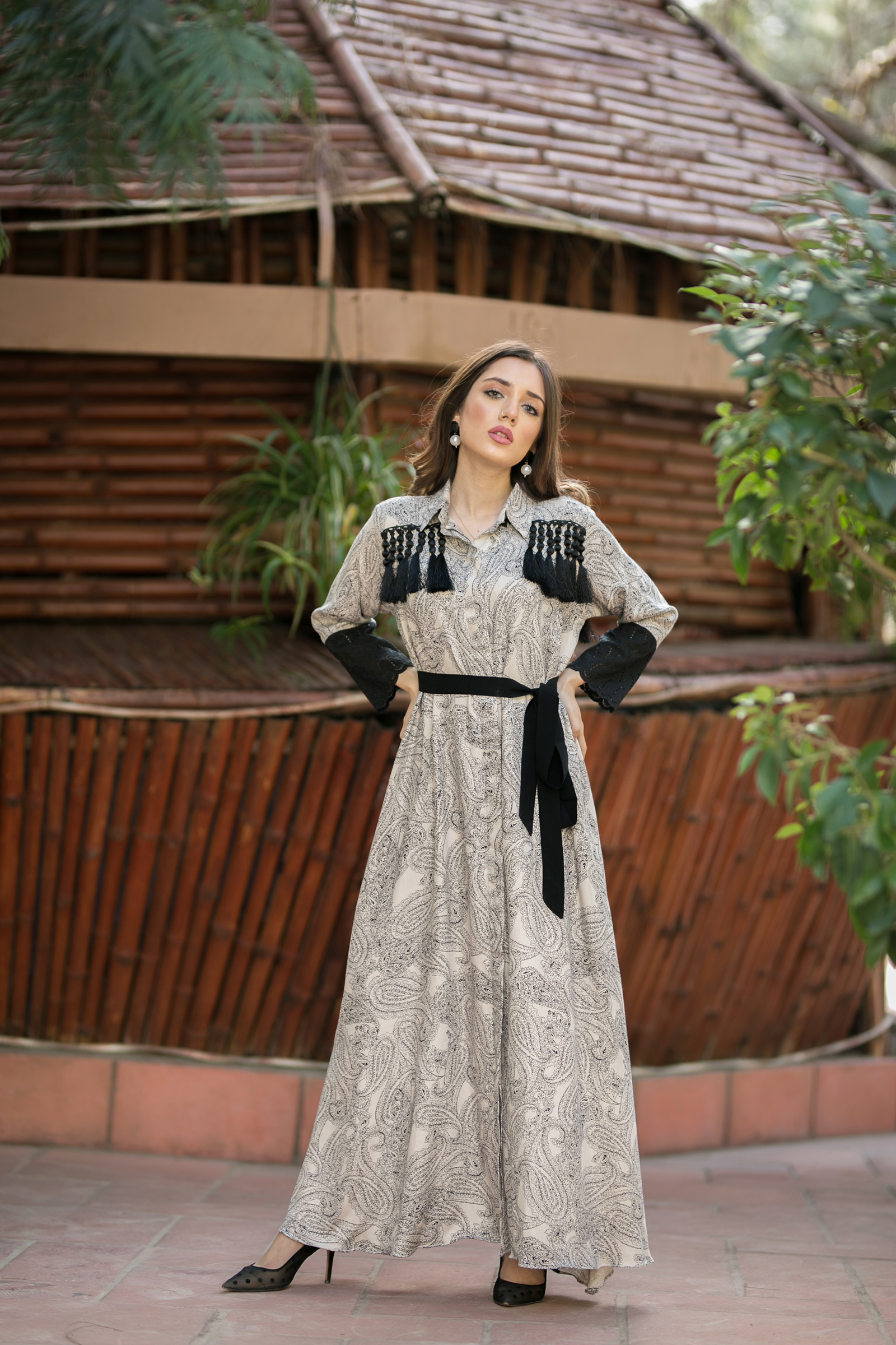 Shahtoosh fabric open long frock Chikan embroidered sleeves patch with tussle detailing on front and back 50 length