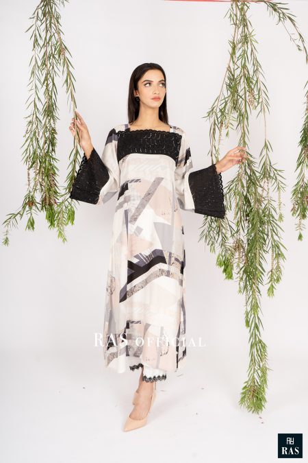 Long A-Line marble pattern shirt in Arabic lawn fabric with chikan patch work. Straight cut trouser adorned with delicate lace. 2 piece set.